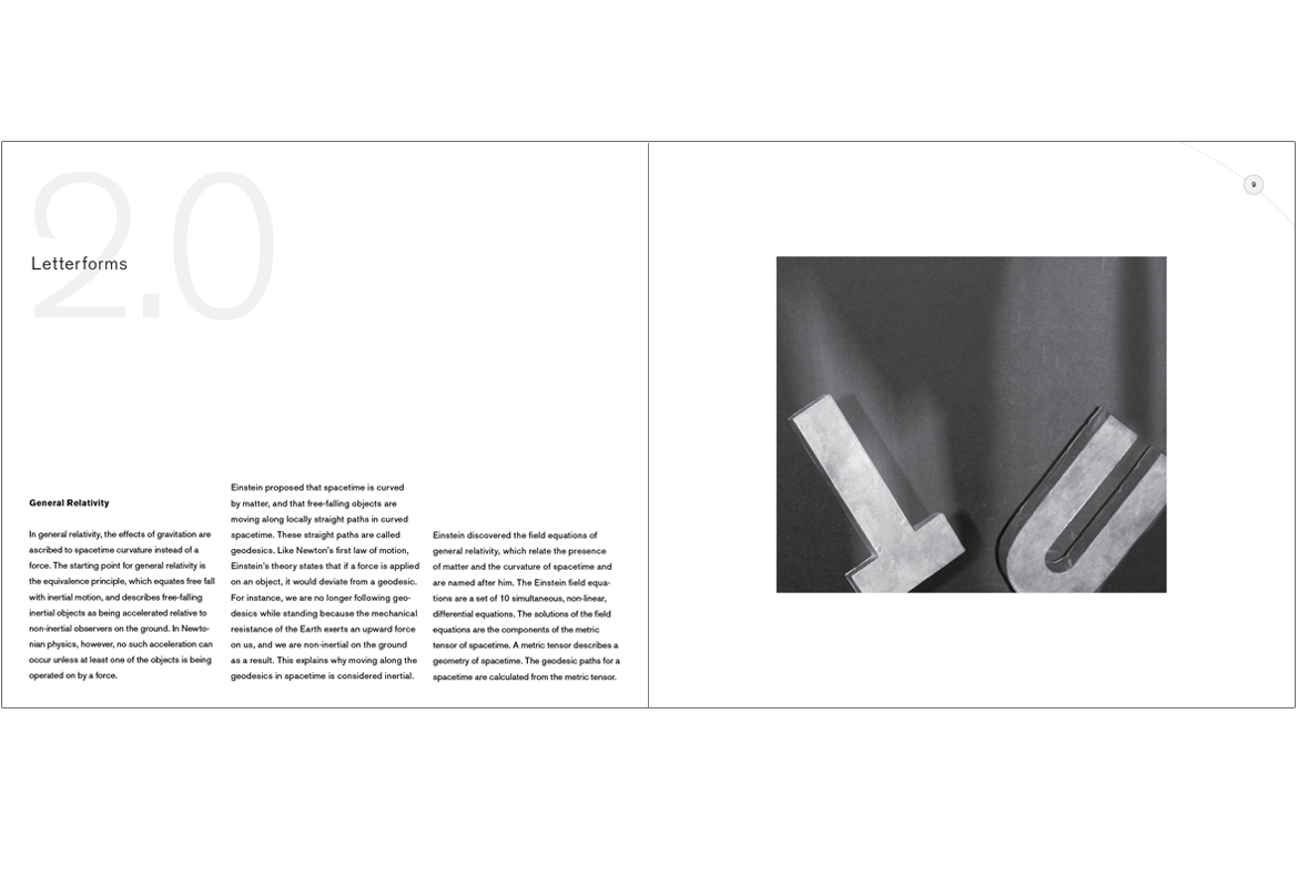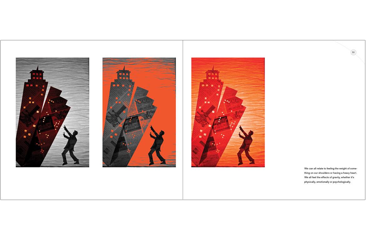 Ten different ways to visually express gravity, ranging from type design, cut paper, photography, infographics and more. Printed book size 8"x7"